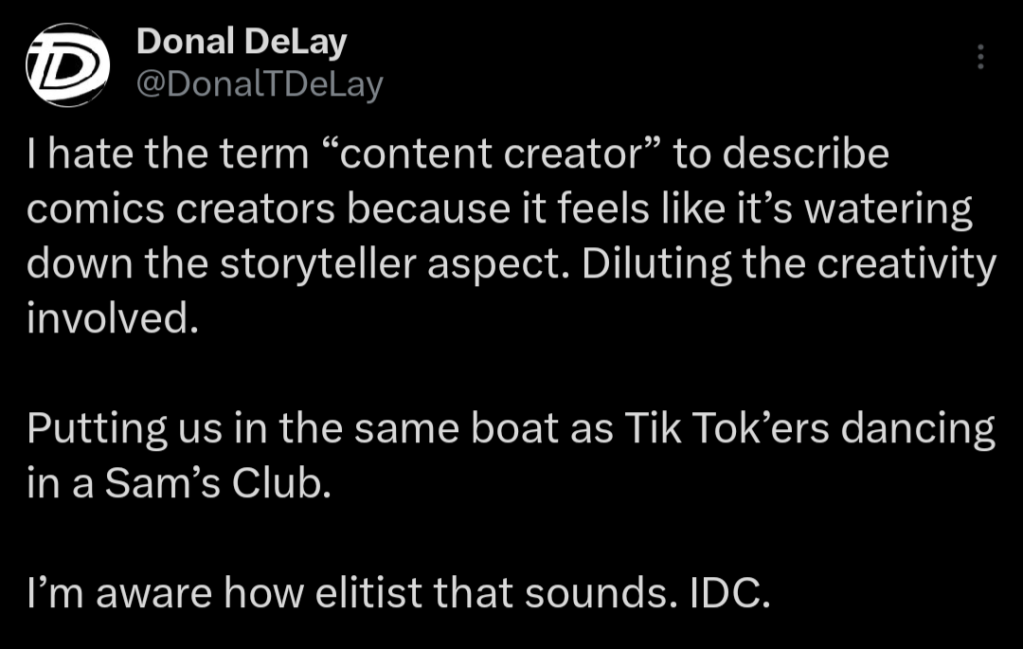 As Donal says, we often refer to ourselves as “content creators”, but why? We who pride ourselves in our artistic and imaginative natures call ourselves such a dry and corporate title.